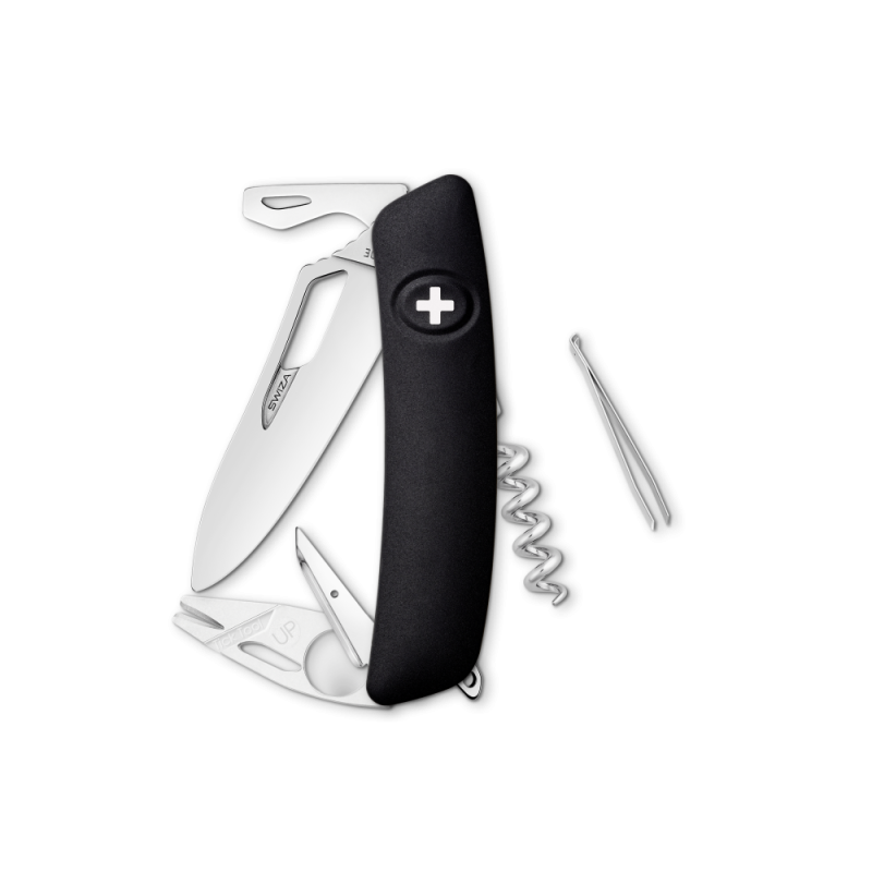 Blocage de sécurité – Lame ouverture une main, 75 mm – Alêne coupante avec poinçon et aiguille à chas – Décapsuleur avec un tournevis N° 3 et un plioir à fil – Tire-tique avec loupe de contrôle Ø 12 mm – Tire-bouchon qualité sommelier – Pincette, 47mm – Anneau